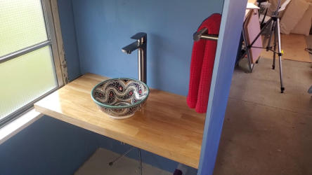 There is a bathroom with a counter and on it a Moroccan handmade pottery vessel sink. There are cupboards under the sink and wall-mounted mirror. The toilet is a purpose-built composting toilet with a urine diverter. Liquid waste goes in its own container. Solid waste goes in a compostable bag. (One-and-done. No warehousing poop.) Watch me build it here.The bathroom is plumbed with a working shower head, but no shower tray on the floor. (I found it easier to use public showers in camp grounds.)