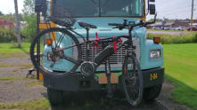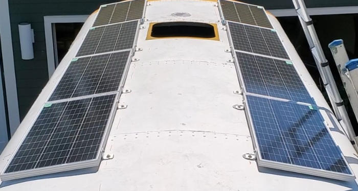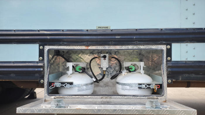 The roof is a highly reflective, elastomeric white paint that creates a waterproof membrane. The hood has been professionally painted in a body shop. The rest of the bus was hand painted with a quality oil paint. Touch ups are easy.There are 800 watts of solar panels on the roof. (Watch them being installed here.) And there are two top-of-the-line Maxxair fans. (Watch them being installed here.)There are twin backup cameras high up on the rear. One is aimed straight back and is a great aid to everyday driving. The other points down towards the bumper for parking in tight places. (Watch them being installed here.)There are four under-mounted aluminum storage boxes. (Watch them being installed here.) One houses the propane tanks for the range and water heater. (The propane installation was done by an RV professional.)Another box houses the fuel for the diesel heater. (For safety, no fuels are stored in the passenger area.) The two remaining boxes are for storage.I have installed a trailer hitch receiver on the front bumper. (Watch it being installed here.) It will accept a bike rack that lets you take your eBikes on the road. (Bike rack not included.)