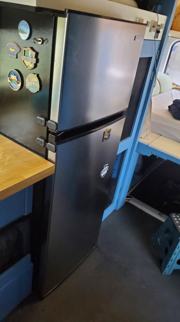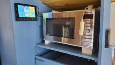 The kitchen features:•more than six feet of solid Acacia hardwood butcher-block counter top;•a large under-mounted sink;•a microwave oven;•a three-burner propane range with oven;•an apartment-size fridge and freezer;•eight solid pine drawers with full extension glides•dimmable under-cabinet lights over each counter top;•shelves over the counters and the fridge for yet more storage space.